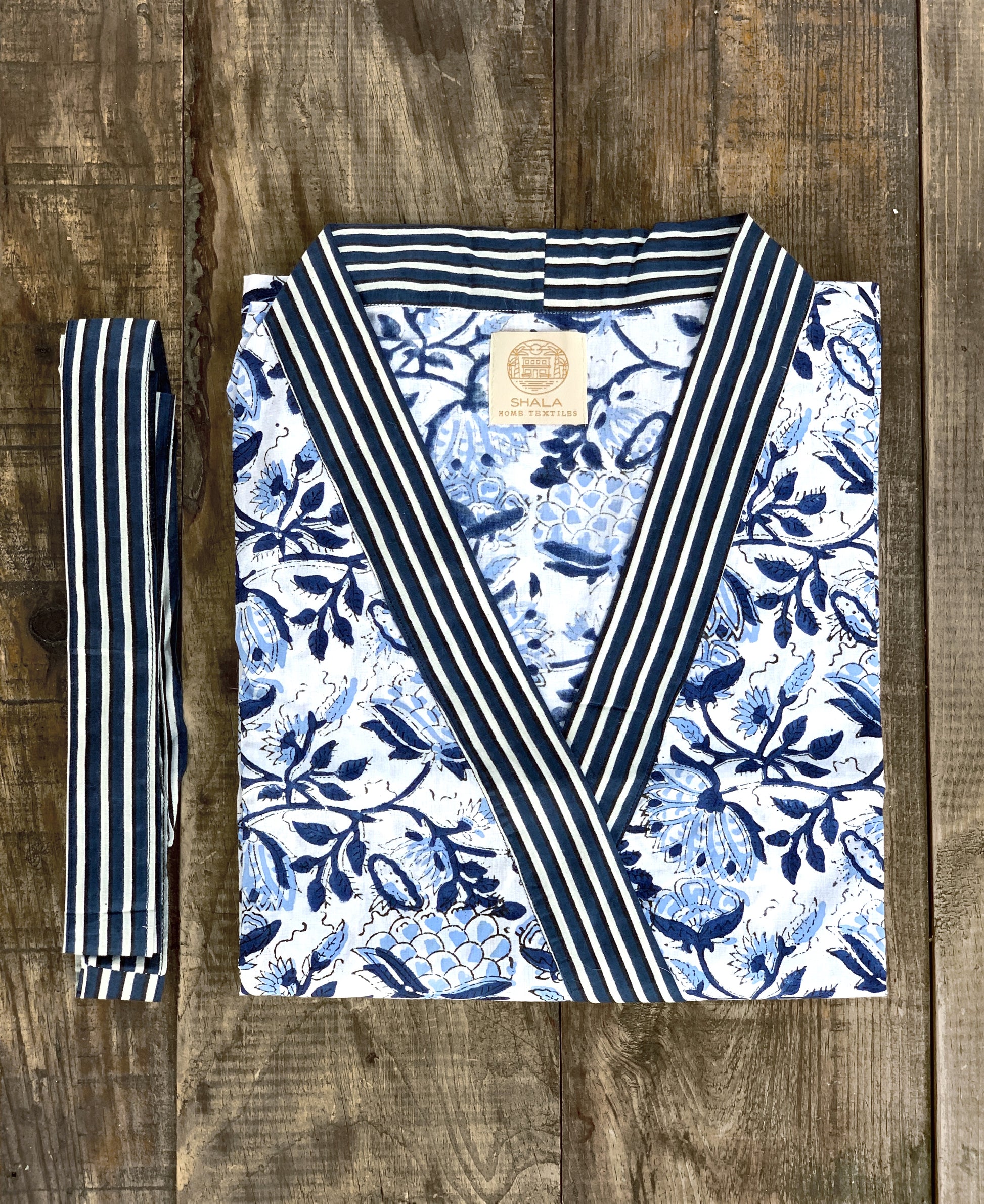 Bata kimono · Algodón puro estampado block print artesanal en India · Bata novia · Bata dama honor · Kimono boho · Azul flores